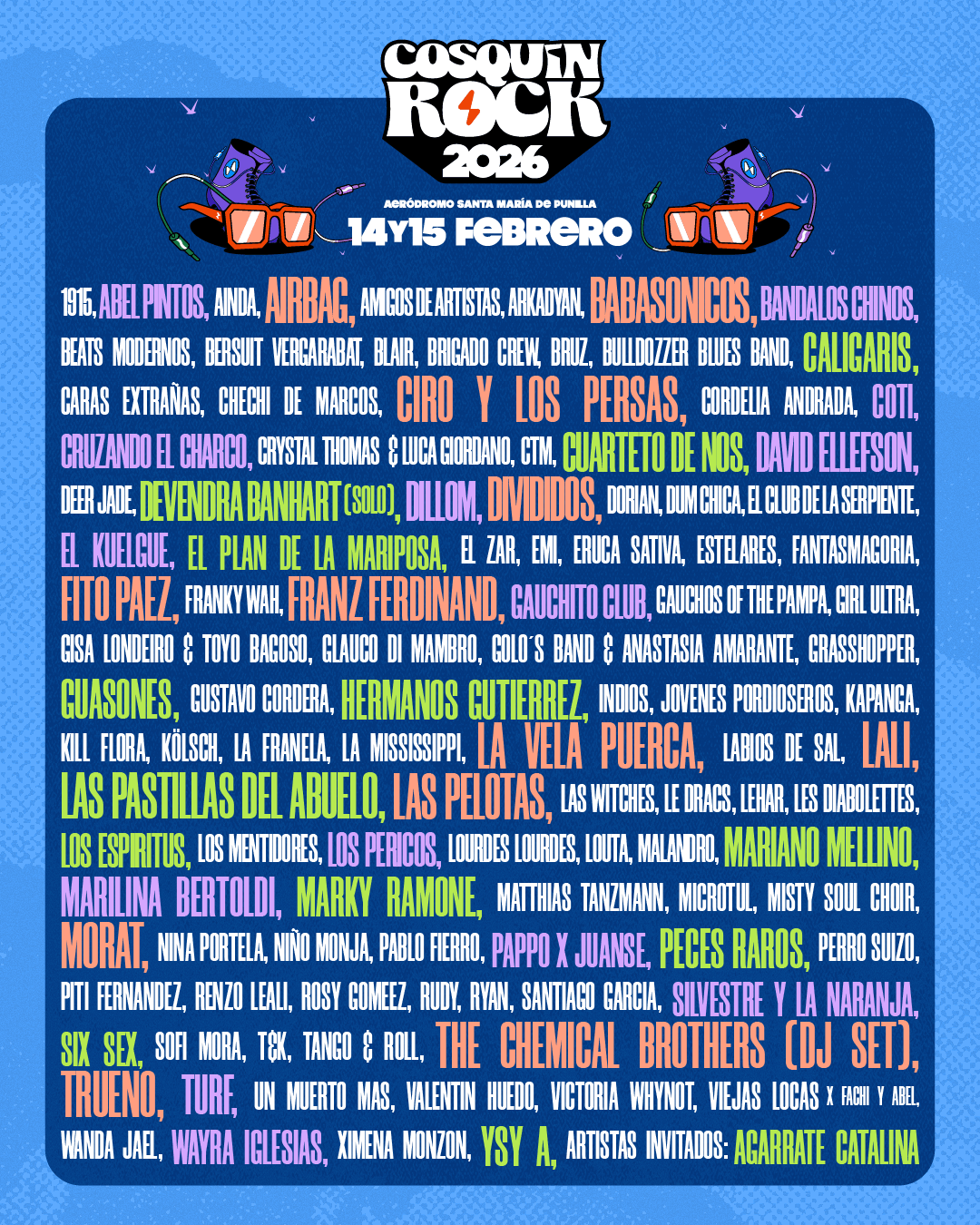 La fuerza nacional estará representada por artistas que hoy marcan el pulso de la música argentina. Airbag dirá presente en Cosquín Rock, luego de agotar tres estadios River, presentando su nuevo álbum “El Club de la Pelea I”.