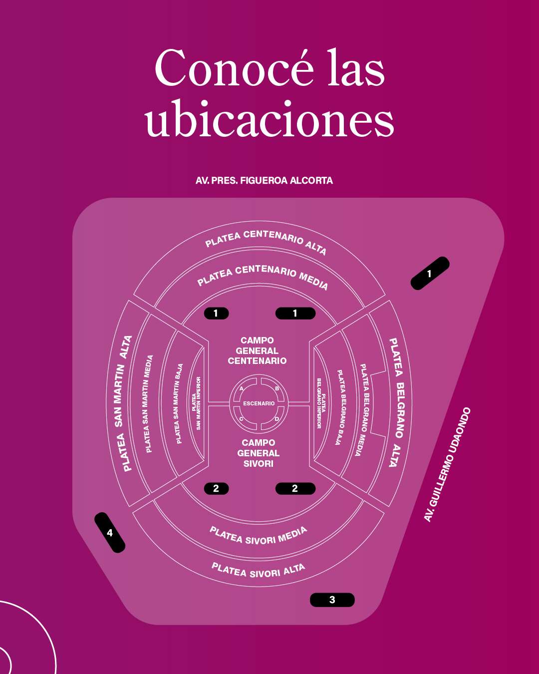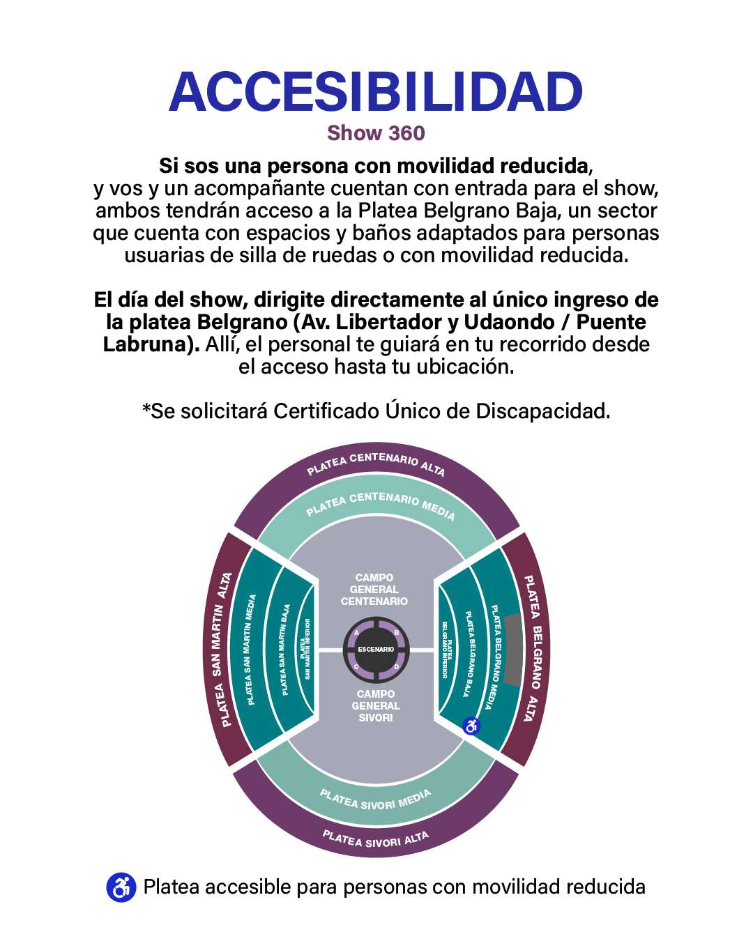 El día del show, dirigite directamente al ingreso de la platea Belgrano (Av. Libertador y Udaondo / Puente Labruna). El personal te guiará hasta tu ubicación. Se solicitará el certificado de discapacidad correspondiente.